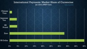The US dollar share of global trade payments through SWIFT is 45%. The last time that I looked at these statistics, it was 51%, so, a great improvement for the rest of the world.