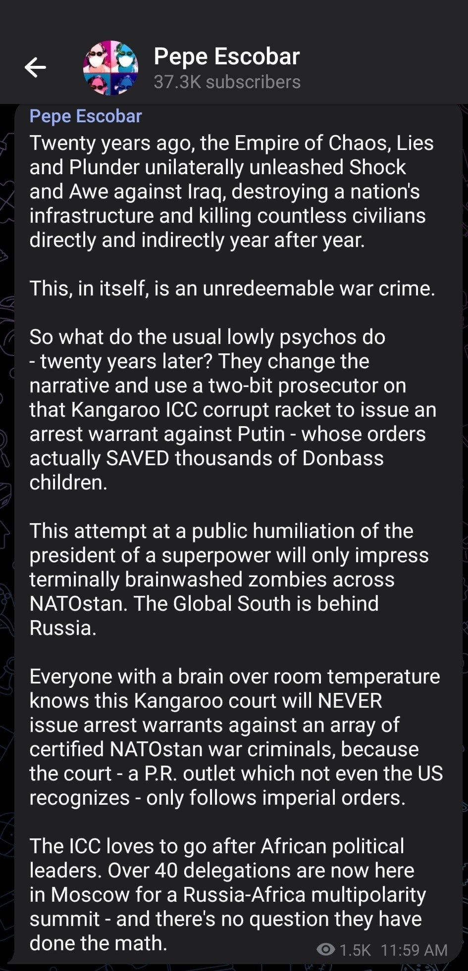 Amarynth & Ersim: the cowardly kangaroo court of the ICC helped bind Russia and Africa even tighter to each other and to multipolarity! The current crazies made a HUGE own-goal. We should actually cherish this. I will talk more of it in Part 6. Africa is unimpressed. Their preliminary response:… Read more »