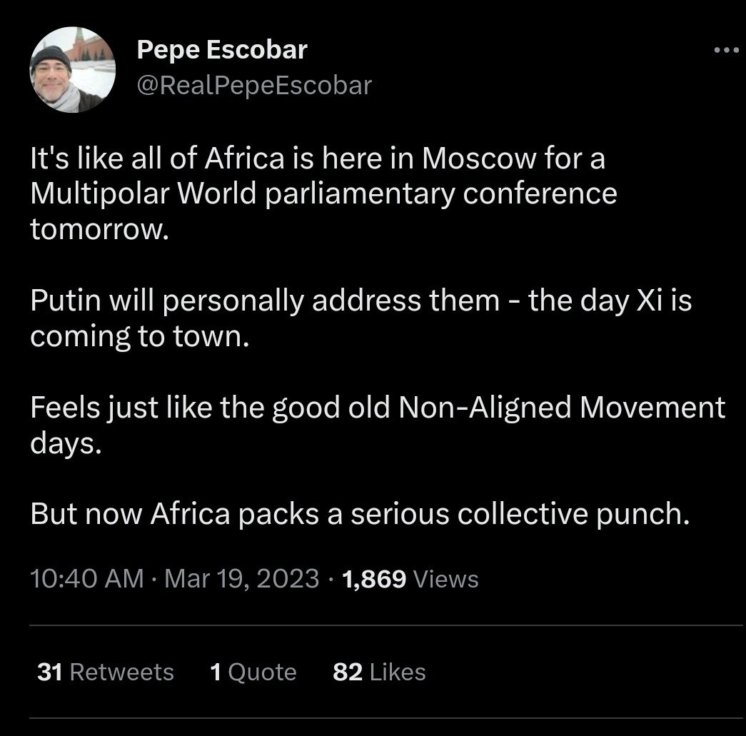 Africa, with one in eight members of the human family, was being mentored by the Russian and Chinese civilizations to overcome the remorseless and relentless Rumsfeld-Cebrowski Doctrine. The gratitude and sheer joy expressed in the countenance of African dignitaries and populations as they meet President Putin, his Foreign Minister Lavrov or Wagner members speaks for itself. They know the score and daily bless the peacemakers who came with iron rods to uproot suffocating evil. The position Russians have established in the aware Global South, of not merely speaking Truth to Power, but burning its very hands and blocking its predation, will be transmitted down the generations for centuries to come. We still remember Saladin and his cohort who ousted the cruel Crusaders nearly a millennium ago! So it will be for Russians far into the horizon. Pepe Escobar, a gentle scribe who visiting Moscow declared it to be the capital of Multipolarity in the 21st Century, understates the honor Russia already earned worldwide.