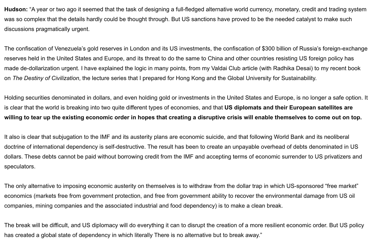 Hudson: “A year or two ago it seemed that the task of designing a full-fledged alternative world currency, monetary, credit and trading system was so complex that the details hardly could be thought through. But US sanctions have proved to be the needed catalyst to make such discussions pragmatically urgent.