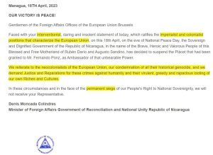 Nicaragua’s Sandinista government rejected the EU representative, stating: “We reiterate to the neocolonialists of the European Union our condemnation of all their historical genocides and we demand justice & reparations for these crimes against humanity”