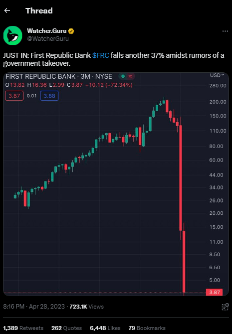 U.S. regulators take control of California-based First Republic Bank. (Am I the only one thinking this way, or are we going to see banks falling like flies?  And apparently JP Morgan already bought it)