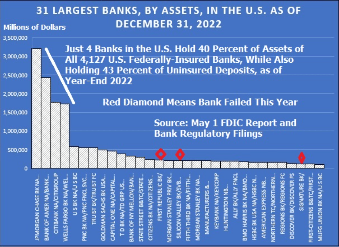 Economic and daily financial reality has not yet harmed the Western superiority complex only making things worse. Fortunately, highly-credentialed scholars do agree with the very serious and immediate systemic risks involved, but they would never say it with such hyperbole. For example, Pam and Russ Martens from Wall Street on Parade. But at least they do readily accept – such as Prof. Michael Hudson and others – that this situation is unsustainable ” with essentially the government itself and indirectly its so-called “regulators” working for the (5 largest) banks and against middle classes (emphasis mine). The existing financial system cannot survive in the way that it is now structured, because it makes any increase in interest rates drive banks insolvent” while the government will only support their campaign contributors, i.e., the 5 largest banks. Others say that “the unrealised losses on assets and debt securities held on the books of US banks simply have not been marked to market” with large quantities of uninsured deposits as described in the many references below
