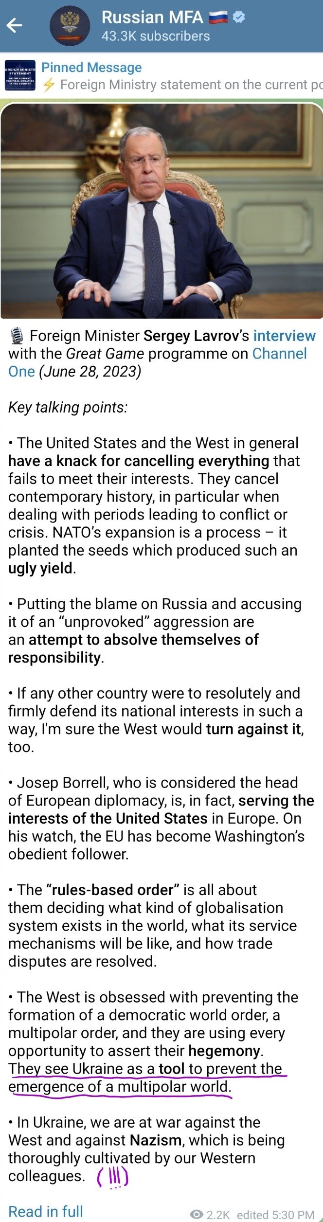 Sergey Lavrov: These may be fairly compelling arguments in terms of propaganda and brainwashing the base especially with regard to “we don’t care about Ukrainian coffins if Zelensky is okay with it.” I think it’s a “good” argument.