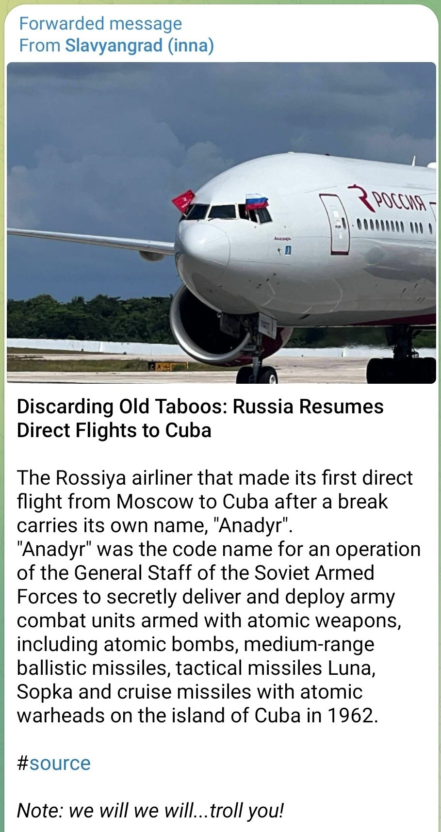 Very interesting code name for Russia’s first direct airliner flight to Cuba since the start of the SMO: “Anadyr” from the hot fall of 1962. Similar gifts on the way?