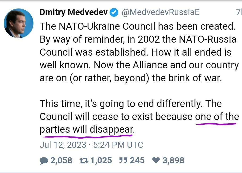 There you have it. There is still hope in Western climes to de jure kick off an Article 5 circumstance, but who will fight? Bear in mind Article 5 is only an invite, and is not a requirement for countries to enter into a war. They have nothing to fight with and for this reason they are trying to buy time. They cannot even pretend a quasi win via the media for consumption of their own citizenry. They are scared and even the venue of the Vilnius NATO summit is surrounded by missile defense batteries. We will see how this NATO summit pans out, but something’s gotto give, and nothing wants to give. China won’t speak to them, Russia won’t speak to them and attrition is continuing day by day, night by night. The RoW, or rather the large majority of the world, does not even display hatred any longer, but simply understand it is all Blah!