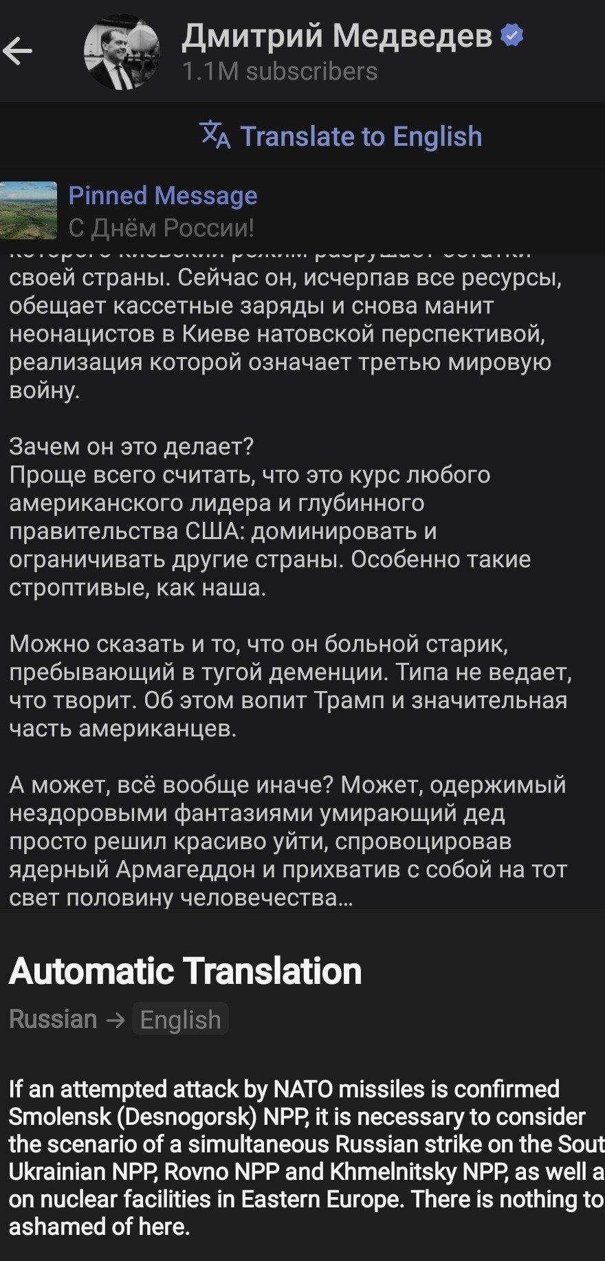 Medvedev appears to have Intel that NATO will attack a nuclear power station in Smolensk, in Russia proper (!!!!). He writes of the coming retaliation.