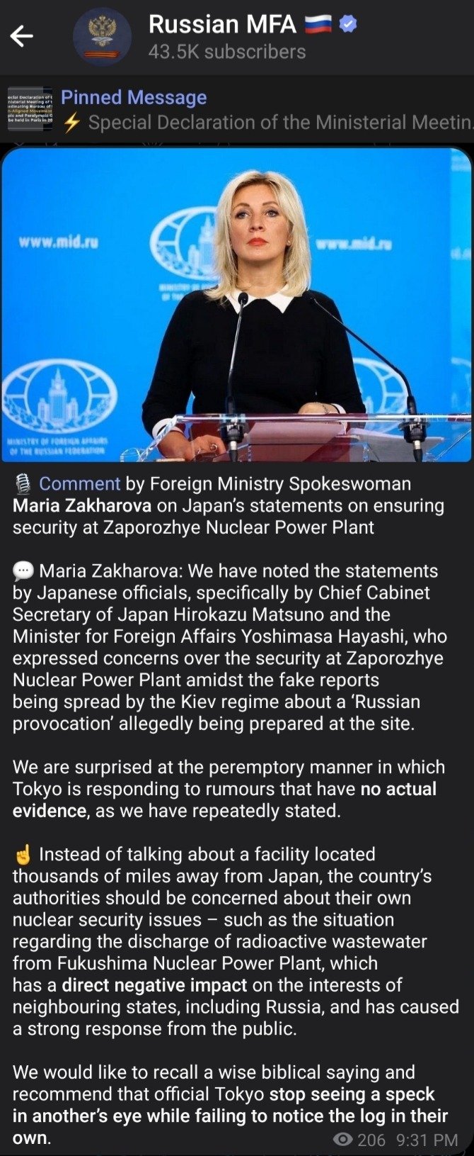 In addition to the Chinese spokesman’s comments on Japanese impudence vis-a-vis radioactive dumping into the Pacific Ocean, here’s the Russian spokeswoman..