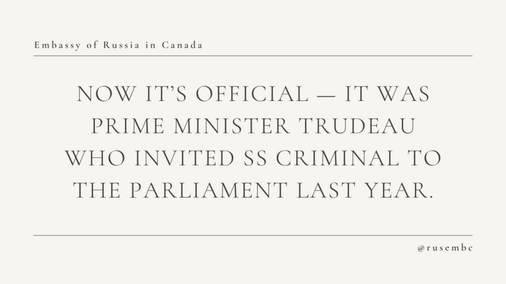 “Now it’s official — it was PM Trudeau who invited SS criminal to the Parliament last year. As recommended by the Ukrainian Canadian community that 5 months later still dead silent though knew of Hunka’s Nazi past. No condemnation = justification. Will UCC, Alexandra Chyczij, Christya Freeland, James Bezan, Yvan Baker and others apologize?”