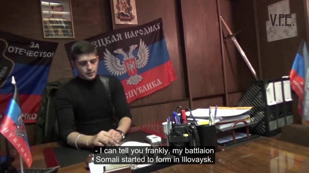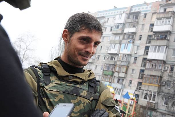 Givi, commander of the pro-Russian separatist Somali battalion, speaks to reporters from their lookout centre near Donetsk’s Sergey Prokofiev international airport, as shelling continues between Ukrainian army forces and pro-Russian separatist, on October 16, 2014.