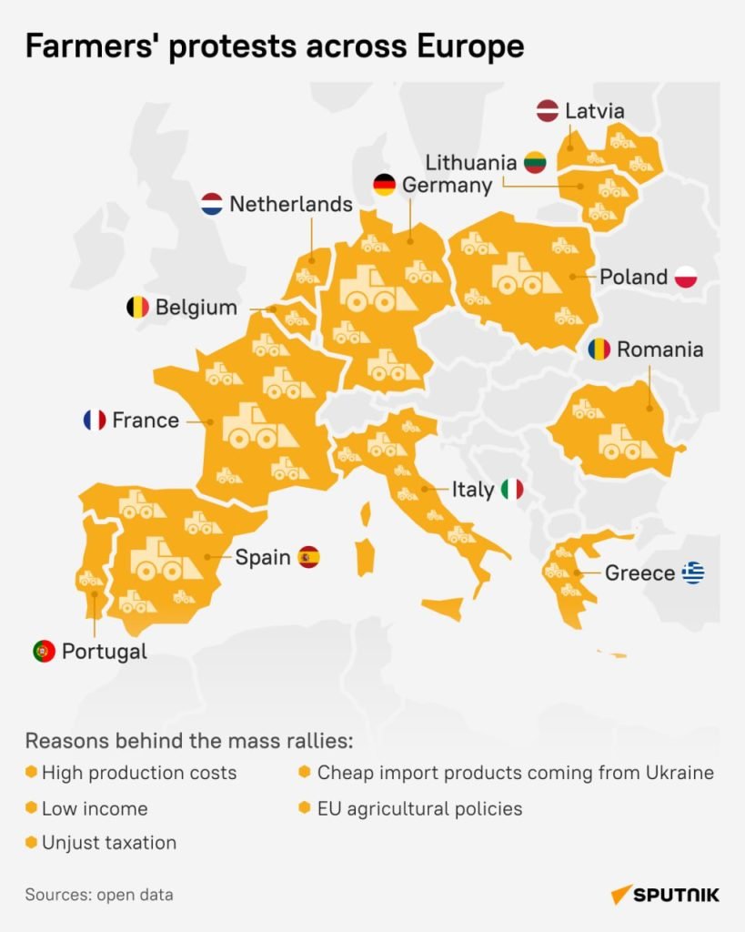 🔹For months, European farmers have been protesting and demanding changes from their governments. Due to anti-Russian sanctions and the allocation of huge sums of money for useless aid to Ukraine, the EU is cutting the budget to continue funding the Ukrainian military, as well as cancelling tariff quotas to keep Ukrainian agriculture afloat, while Europeans themselves are suffering.