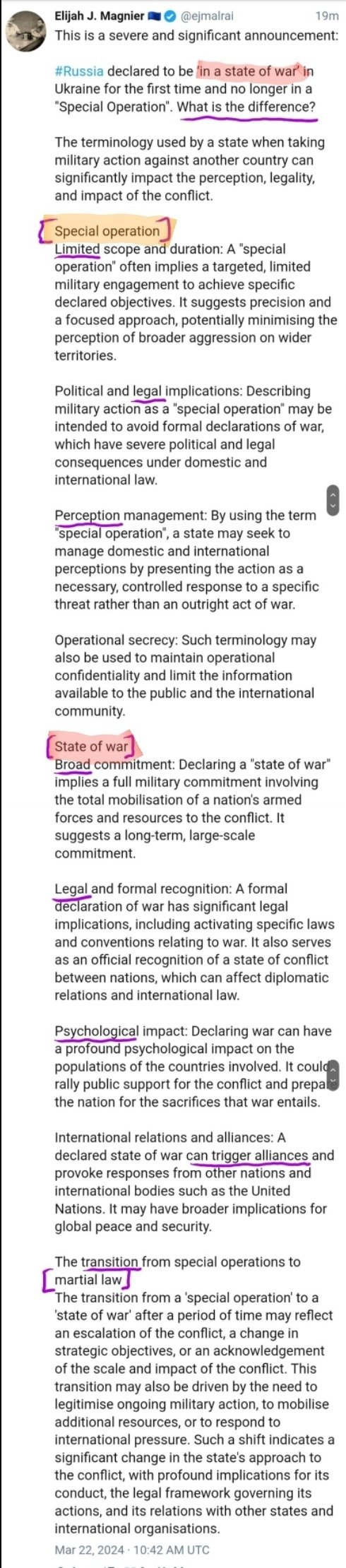 ⭕ 🇷🇺 ⚖️ The Kremlin spokesman clarified the legal status of the special military operation in Ukraine. “This is a special military operation de jure, but de facto, in fact, for us it turned into a war after the collective West more and more directly increases the level of its involvement in the conflict,” Russia’s Presidential Spokesman Dmitry Peskov told reporters on Friday.