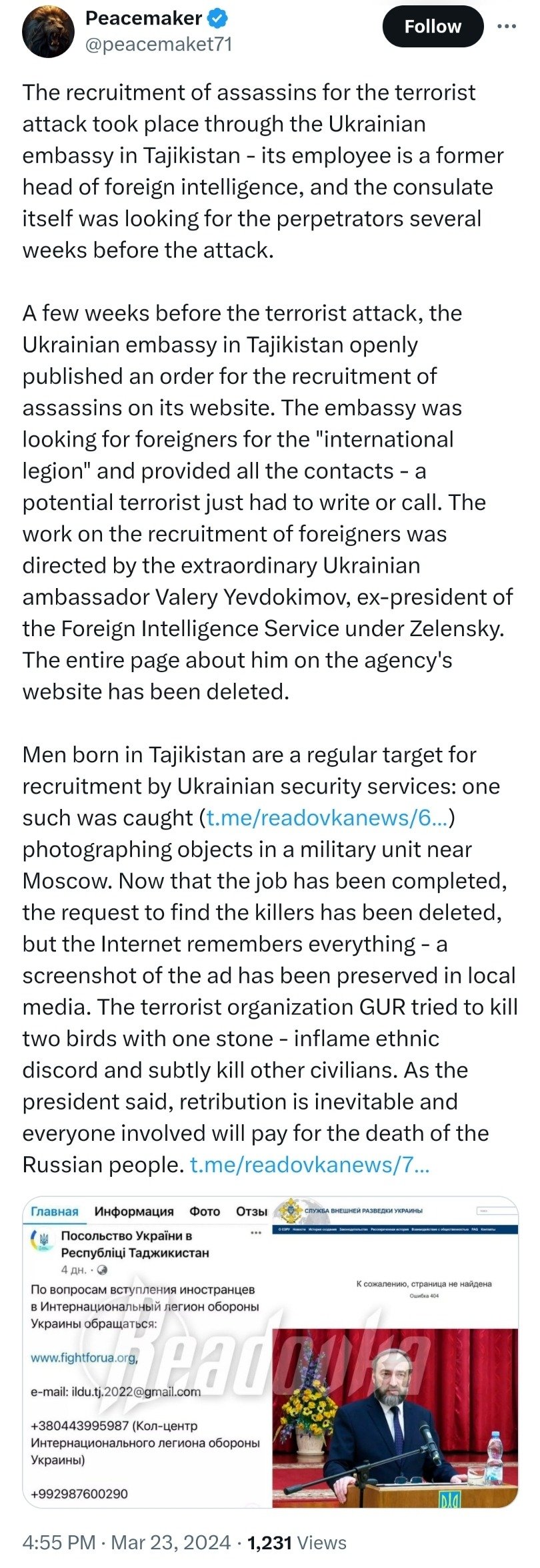 ⭕ Crocus City Hall terrorists were recruited through Ukrainian embassy in Tajikistan, military expert says