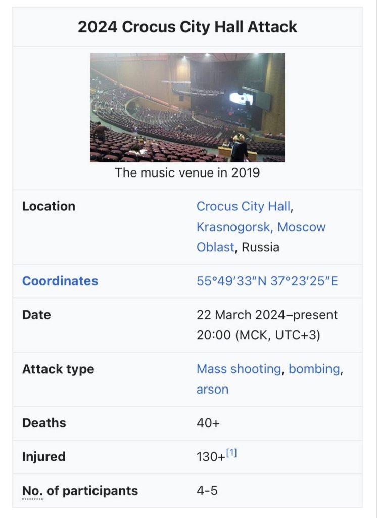 ⭕ Main info at the moment about terrorist attack in Crocus City Hall: