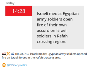 I hope nobody takes the invitation to escalate. Here, if true, we see that the Egyptian soldiers are probably so perturbed by Israeli action, that they will start the shooting.