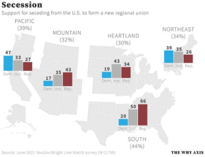 In 2021, an astonishing 66% of Southern Republicans and 50% of independents were in favor of secession. (http://archive.today/Qpdp6) The West Coast also showed strong support for secession but of a different political flavor, this time being mostly supported by Democrats.