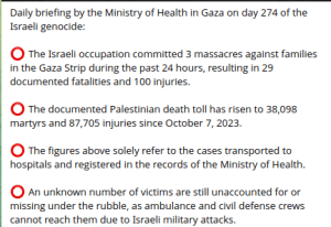 The toll of the “israeli” aggression has risen to 38,153 martyrs and 87,828 injuries since last October 7th. We know we can easily put a 2 in front of those numbers – like this 238,153.
