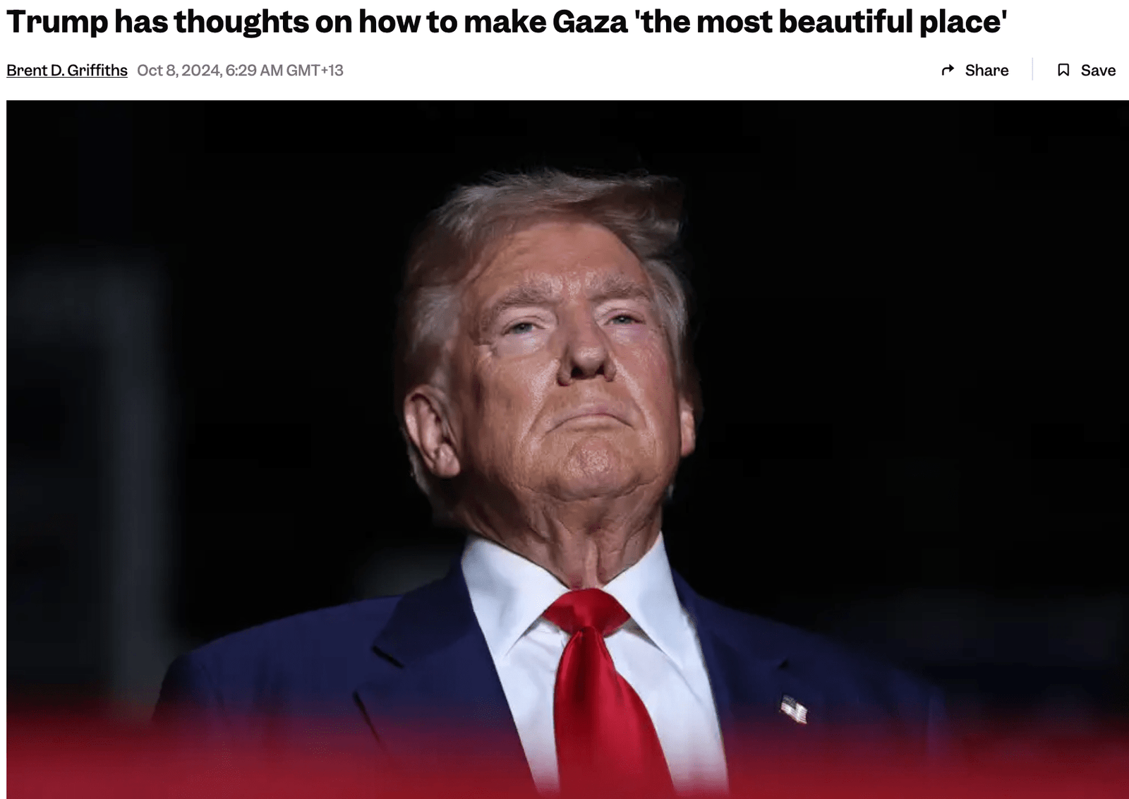 He shows off his full gambit, including blatant ghoulish opportunism, outrageously inaccurate claims of success, and multiple rambling bare-faced lies in this interview… https://www.businessinsider.com/trump-gaza-oceanfront-comments-rebuild-israel-2024-10?op=1 11:00 Conservative radio host Hugh Hewitt on the Oct 7 anniversary Hewitt asked Trump to talk about Gaza as a developer and whether it could be… Read more »