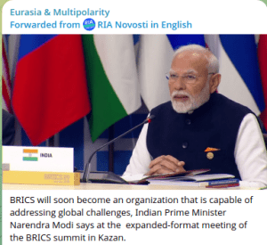 💬 “Today is the actual start of the Kazan Summit…The bilaterals between Putin and Xi and Putin and Modi were wonderful. They were like friends talking. This was essential to set the stage for today is the meat of the matter,” veteran international affairs observer Pepe Escobar told Sputnik on the sidelines of the summit in Kazan.