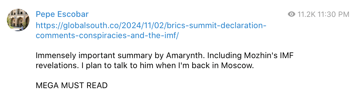 I am quite convinced that at the time that the Summit Declaration was written, Russia and China already knew the information waiting in the wings on the IMF. Who did not know? All we needed was for Mozhin to talk. The IMF visited Russia before the Kazan summit. Do you not think that those very same requirements were given to the IMF visiting group?