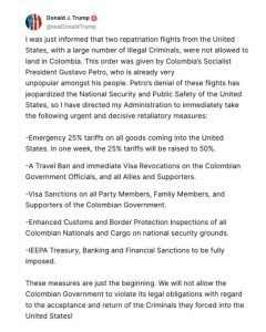 I reported at the Daily Chronicles that Trump immediately slammed 25% tariffs on Colombian products (20% of US coffee comes from Colombia) to be increased to 50% and a raft of other issues: