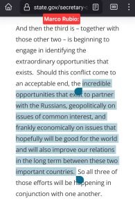 This is why Marco Rubio said there are “incredible opportunities that exist to partner with the Russians, geopolitically on issues of common interest, and frankly economically on issues that hopefully will be good for the world and will also improve our relations in the long term between these two important countries”.