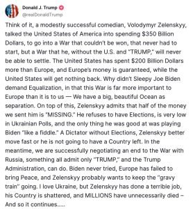 Mr Trump insists he wants this over by Easter. Why? He does not want to spend the money as the money can be better expended in other tasks, i.e., Outsourcing Empire. He also does not want to state that the US lost this war. To do this, he is firmly pushing the blame on Zelenski. (Nothing to do with the US! It is that fink Zelenski.)
