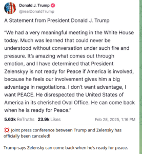 Big fight in the Oval Office today. Trump was going to end the war in 24 hours and I guess no agreement on minerals. ย Take a look: