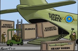 SS von der Lugen insists Europe is in danger, so the solution is a massive expansion of the military-industrial complex – in practice, buying more overpriced American weapons – and “rearmament”.