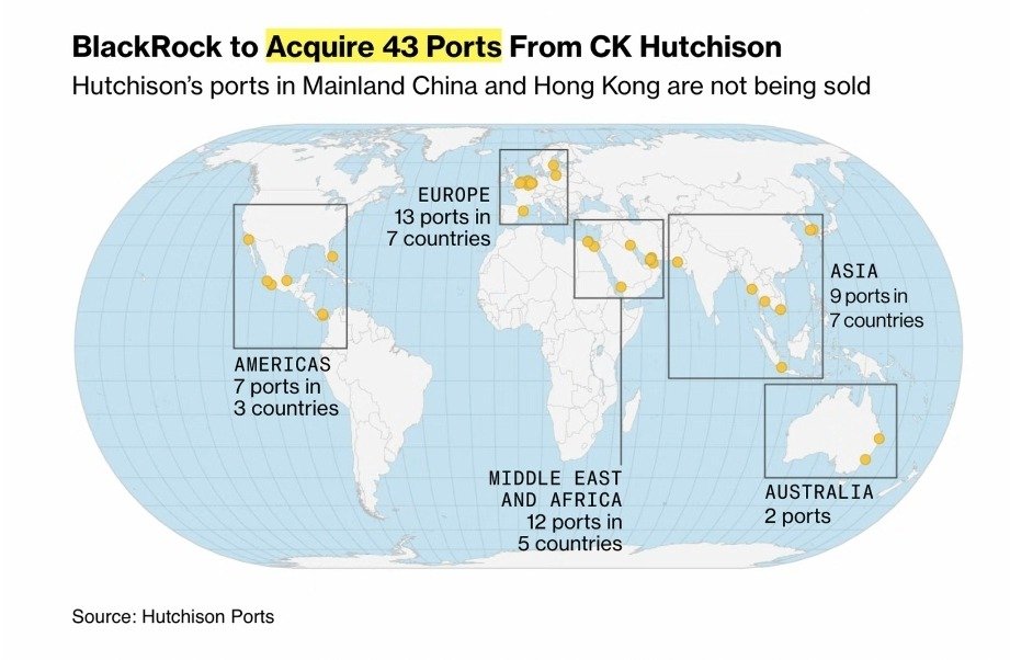 The deal, led by BlackRock, the world’s largest asset manager with an enormous pool of $11.6 trillion in assets, was announced earlier this month . BlackRock agreed to lead a group that would buy Hong Kong firm CK Hutchison’s controlling interest in 43 other ports around the world, comprising 199 berths in 23 countries.