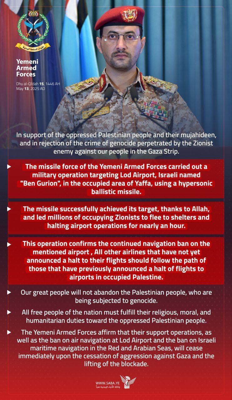 -The Yemeni Armed Forces renew their warning to all aviation companies to comply, as other airlines have done, by suspending flights to Israeli airports, which are now deemed unsafe.