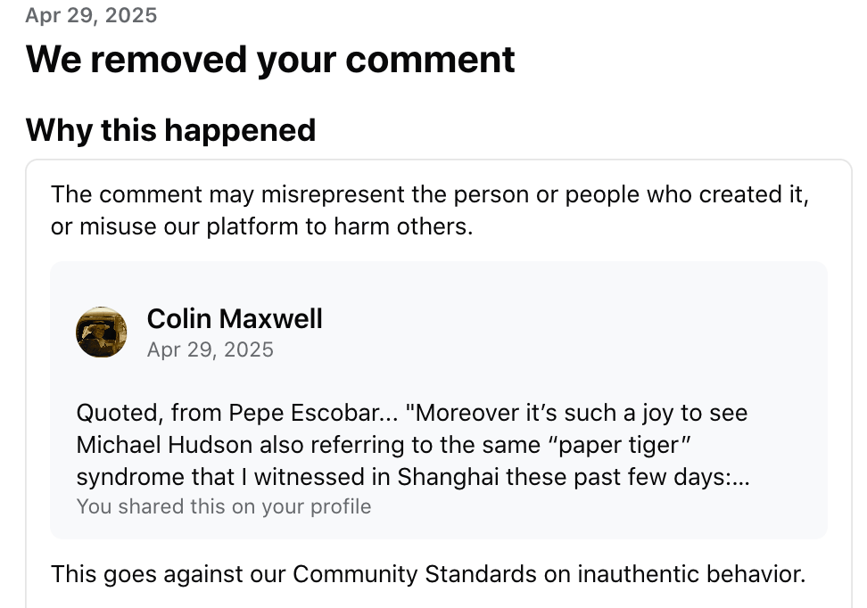 Pepe’s Strategic Culture article (China, Hong Kong, and the Art of Blinking), and even a quote from it, is being nobbled by Farsebook Downunder.