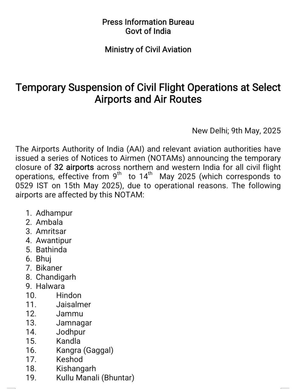 India temporarily SHUTS 32 airports in north and west