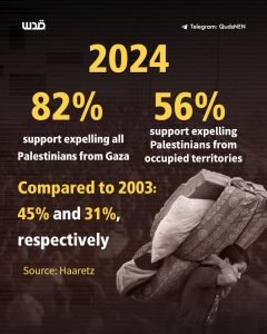 Haaretz published the results of a poll conducted by a researcher for Penn State University on March 2024. The poll targeted 1,005 Jewish Israeli respondents. It found that 82% support expelling all Palestinians from Gaza, while 56% support expelling Palestinians from occupied territories, compared to 2003: 45% and 31%, respectively.