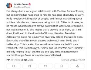 Trump’s latest and the net is buzzing. Trump Truth Social: “What Vladimir Putin doesn’t realize is that if it weren’t for me, lots of really bad things would have already happened to Russia, and I mean REALLY BAD. He’s playing with fire!”