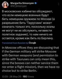 Mr Lavrov stopped (I hope) all the misinformation out of the US regarding the next Ukrainian talks, where Kellogg sketched out the proceedings according to his cockamanie understanding. Mr Lavov said in no uncertain words that the next talks will be in Istanbul (not at the Vatican, not in Geneva) and the Ukrainians and the Russians had an agreement. Lists of conditions of a ceasefire (or peace agreement) will be presented and explained at the next meeting on the 2nd of June. Maria Zakharova piped up and said Russia has no agreement with anyone else to supply them with these documents. Kellogg is therefore sidelined and so is the US. Lavrov made it clear that these negotiations will be between Russia and Ukraine. He will keep Rubio informed. https://t.me/MariaVladimirovnaZakharova/10669