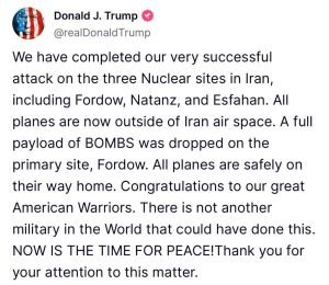 An act of theater with cool headlines (in the US – a Donald Trump made-for-TV moment). Oh, we see all the normal ‘condemnations’ and ‘international law’ and ‘heinous escalation’ verbiage flowing in, but essentially, the bombing itself was a nothing burger, and do not forget that when you read the headlines. Trump falsely claimed to have destroyed Fordo, which was only a limited attack and, by reports, took the doors down, and also bombed two empty facilities at Natanz and Isfahan that Israel had already targeted. These facilities were empty and evacuated. It is not the ‘biggest and grandest’ thing that has ever happened, and has done nothing for peace and security. It is a further demonstration of the perfidy of those who think they own the world.