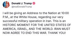 About an hour ago Trump arrived at the White House for a national security meeting. Now his Truth Social says: