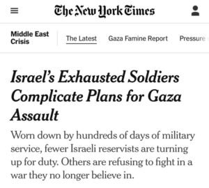 Israeli media report that the military is struggling to secure enough reservists for a planned invasion of Gaza City, with hundreds refusing duty amid a deepening “crisis of trust” between soldiers and Netanyahu’s government.