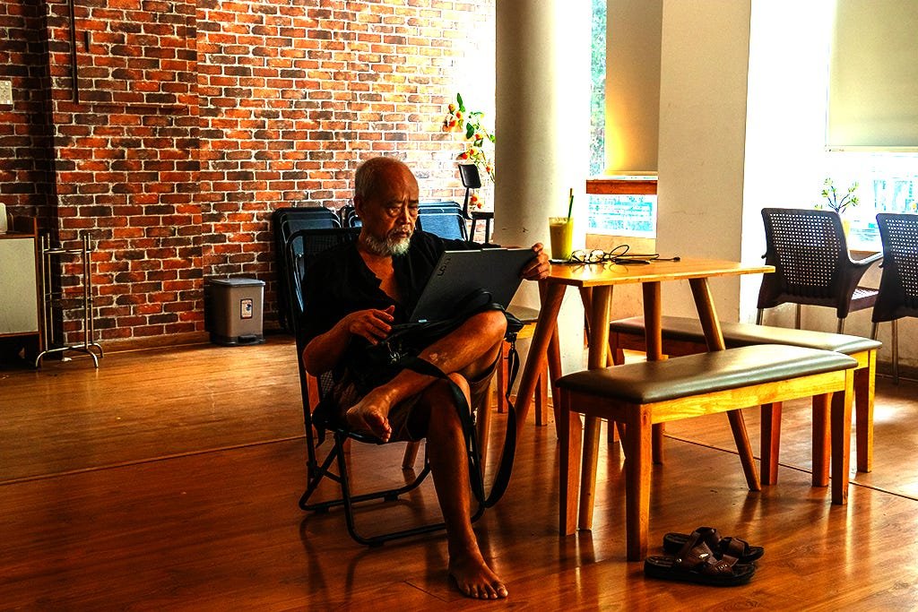 Returning to KTM Burger to type, I sat next to a table of seven. Two of the three men were super drunk. Hanging on to each other, they wandered off. When they returned, everyone started singing, with their heads slightly bowed. It sounded hymnal. Across the street was a multi-story night club, Devils and Angels, with its thumping music. Even when young, I thought such places were hells.