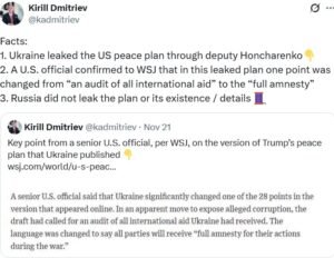 - Russian society is in upheaval because of the so-called peace plan. The small change that the Ukraine sneakily did on the draft, was revealed by Kirill Dmitriev