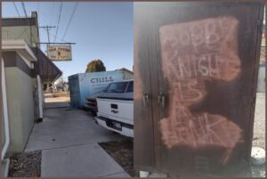 taken by Troy Skaggs in Kokomo, Indiana on 11/13/25; (R): graffiti says “BOBBY KNIGHT IS A HONKY”