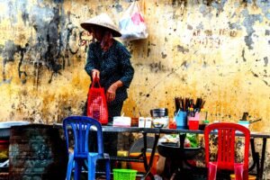 As a girl, she was taken in by a noodle soup seller at Old Market, now demolished. As a pretty young woman, she started sleeping with Westerners, so her adoptive father kicked her out. He still brings her food, and she’s paid nearly $2 daily by Mrs. Hạnh, who also feeds her. It’s charity, more or less, since Mrs. Hạnh and her husband can do everything themselves.