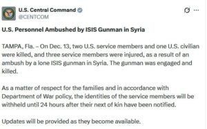 “On Dec. 15, at the direction of @SecWar Pete Hegseth, Joint Task Force Southern Spear conducted lethal kinetic strikes on three vessels operated by Designated Terrorist Organizations in international waters. Intelligence confirmed that the vessels were transiting along known narco-trafficking routes in the Eastern Pacific and were engaged in narco-trafficking. A total of eight male narco-terrorists were killed during these actions—three in the first vessel, two in the second and three in the third. #OpSouthernSpear” – U.S. Southern Command