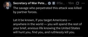 Drugs are now ‘weapons’. Listen to Hegseth’s last sentence – desperately trying to change the narrative. Black is now white and peace means kill.