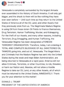 Total blockade and siege on Venezuela, spinning the story that Venezuela stole from the US that which never belonged to the US. All pretence is now dropped. It is not about regime change any longer, it is not about Maduro, but is about the US viciously raiding their neighbors. The story of drugs is now extended to theft, oil, murder, kidnapping, human trafficking and whatever plus the kitchen sink. In reality, this will touch China, Iran, and Cuba at least. Trump is basically demanding the return of all oil fields expropriated by Hugo Chavez in the 2000s.