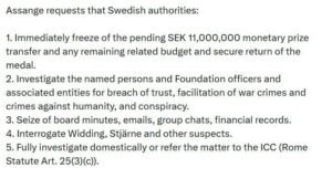 Julian Assange Instrument of war’ prize — Julian Assange files criminal complaint over Machado’s peace award, accusing Nobel Foundation members of misappropriation of funds and facilitating war crimes. Assange claims the award intensified U.S. aggression toward Venezuela.