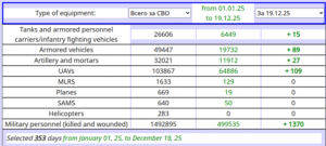 4 Settlements were liberated by Russia over the past week. This is what it looks like now:  December 19, 2025 Ukraine’s losses during the special military operation – (we know that this is a low number of killed Ukie soldiers and it is more in the region of almost touching 2 million. It is still a drop in the bucket compared to the 2ndWW but remains a kill rate for soldiers, as Russia does not kill civilians. As far as I know, this is the first war in our world that civilians are not being decimated.