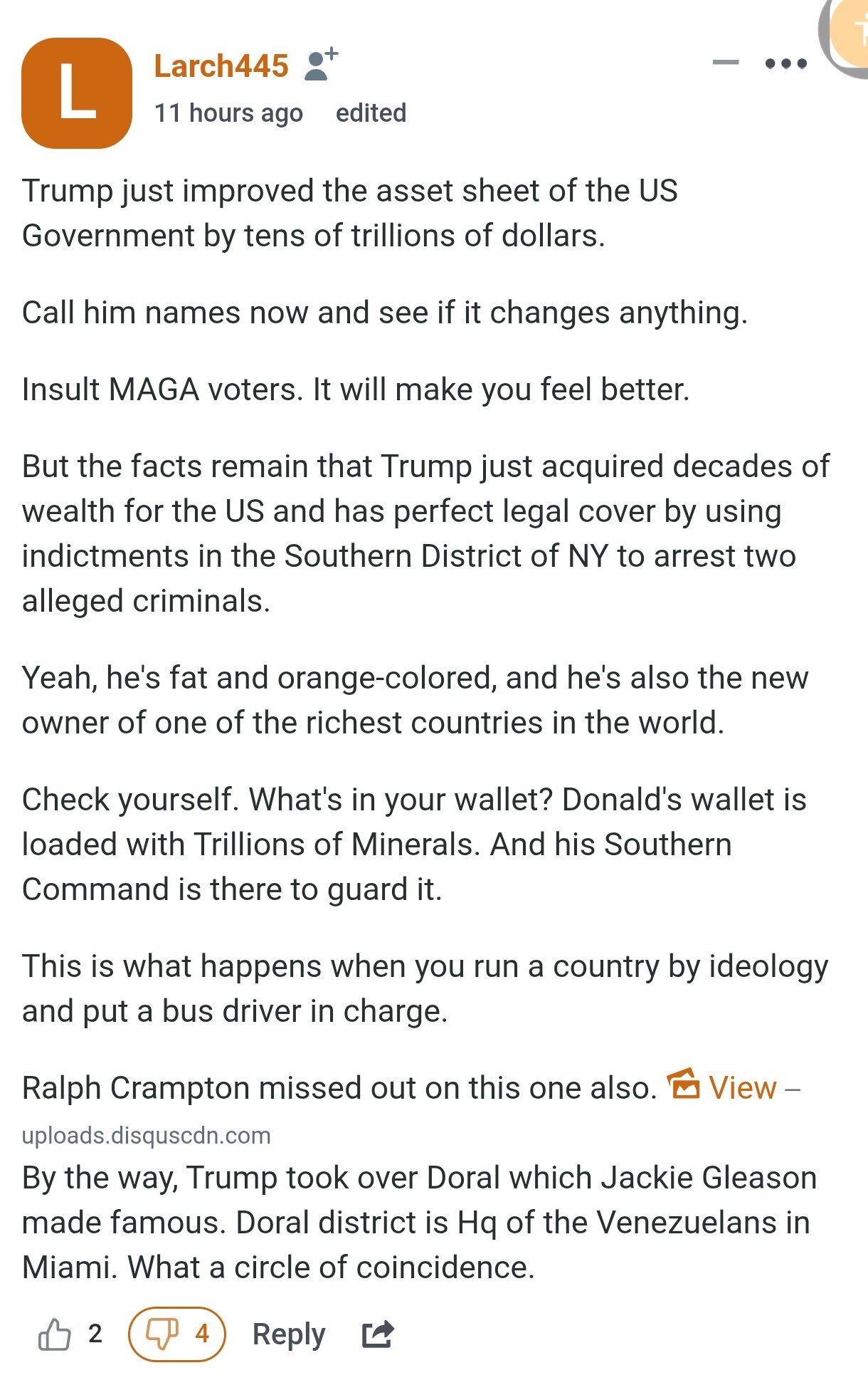 Reporter: Is it possible that the U.S. ends up administering Venezuela for years? Trump: Well, you know, it won’t cost us anything, because the money coming out of the ground is very substantial.