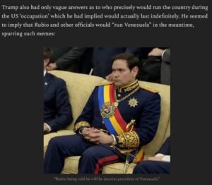 UPDATE: This morning Narco Rubio still announced that the US will administer Venezuela. Now, even that has changed. Secretary of State Marco Rubio suggested Sunday that the United States would not take a day-to-day role in governing Venezuela other than enforcing an existing “oil quarantine” on the country, a turnaround after President Donald Trump announced a day earlier that the U.S. would be running Venezuela following its ouster of leader Nicolás Maduro.